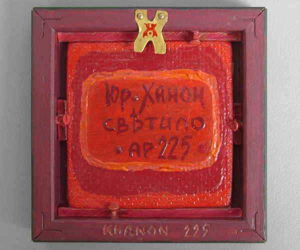 Юр.Ханон. «Свѣтило»: ар 225, масло, оргалит, 62 x 61 (полный размер 85×85 мм). Не размениваясь на живописные мелочи, эта очень маленькая картинка в самой общей форме даёт свою лапидарную версию мировой космогонии на примере одного из объектов средней величины. Силы гравитации, а также методы образа и подобия, представлены на ней в простой и доходчивой форме. Отдельно привлекает внимание, что для получения адекватного изображения, участвующие в сюжете действующие лица не нуждаются в глазах. Последнее обстоятельство, вероятно, должно подчеркнуть особую наглядность происходящих событий. Как всегда, проблемная фотография даёт о картине представление самое скудное.